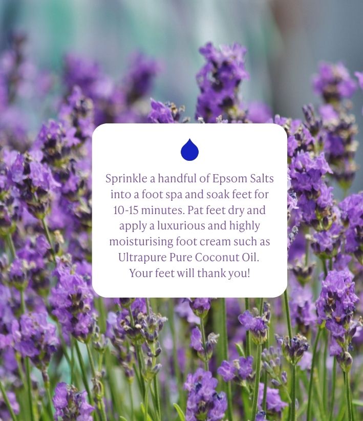 Sprinkle a handful of Epsom Salts into a foot spa and soak feet for 10-15 minutes. Pat feet dry and apply a luxurious and highly moisturising foot cream such as Ultrapure Pure Coconut Oil. Your feet will thank you!
